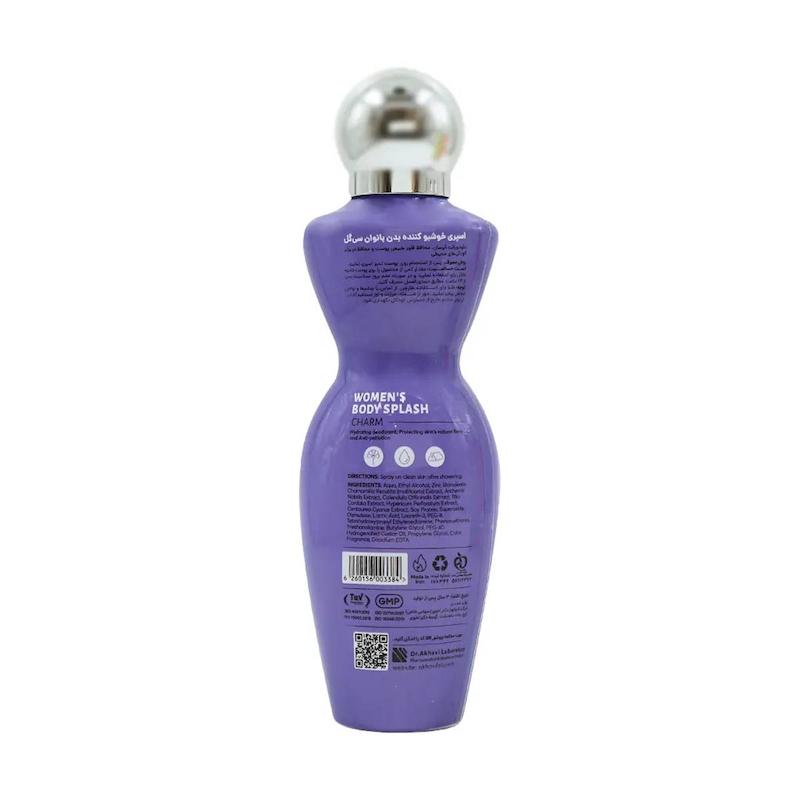 این محصول با رطوبترسانی سبک به پوست، کمک میکند بوی بدن کمتر حس شود و از ترکیبات گیاهی در فرمولاسیون خود بهره میبرد. همچنین فاقد چربی است و بوی شیرین و متعادلی دارد که پخش بوی متوسط و دوام متوسط آن را برای استفاده طول روز مناسب میکند. بادی اسپلش سی گل Charm تولید ایران است و دارای مجوز رسمی 56/12362 است.