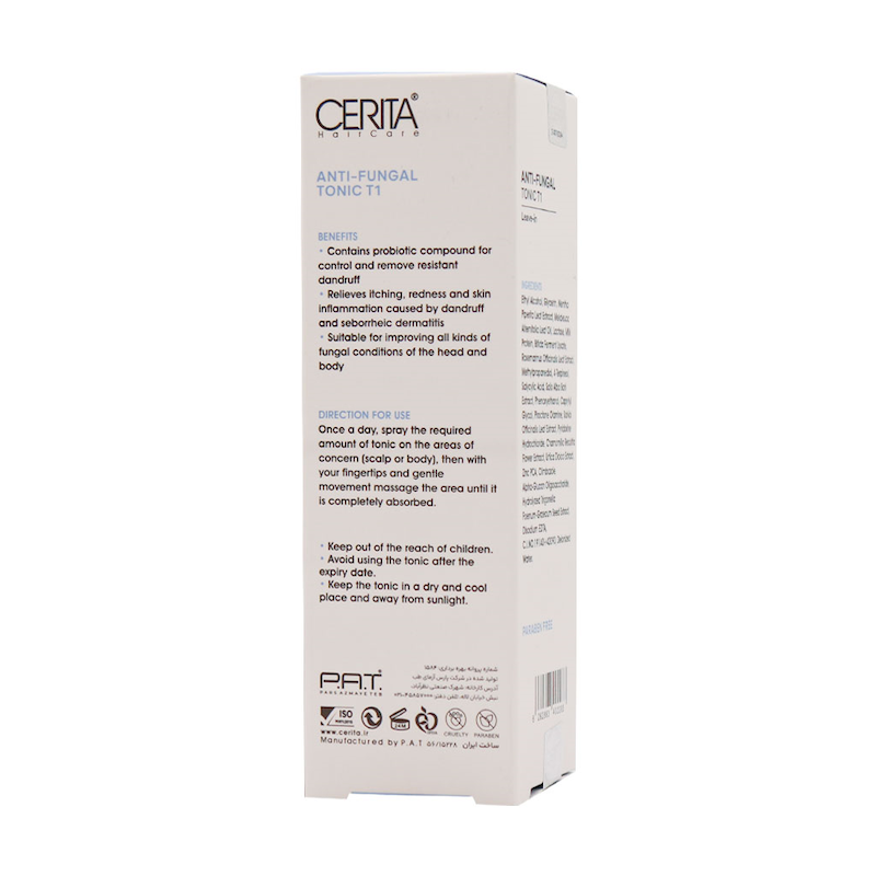 تونیک تقویتکننده و ضدشوره موی سریتا مدل T1 با حجم ۶۰ میلی لیتر، حاوی شنبلیله، رزماری، کلیمبازول، گزنه، اسید سالیسیلک، ویتامین B6، محصولی مؤثر در مهار انواع شورههای مقاوم به درمان است. این تونیک با افزایش خونرسانی به پوست کف سر و تقویت ریشۀ مو به درمان ریزش موی ناشی از شوره میپردازد و خارش و التهاب را کاهش میدهد.