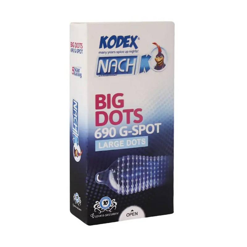 کاندوم ناچ کدکس مدل BIG DOTS بسته ۱۰ عددی، محصولی از برند ناچ کدکس (Nach Kodex) است که برای افزایش تحریک و لذت جنسی طراحی شده است. این کاندوم با نقاط برجسته و ارتفاع بلند در سراسر طول خود، به تحریک نقطه جی و افزایش میل جنسی بانوان کمک میکند و تجربهای لذتبخش و متفاوت فراهم میآورد. همچنین مواد روانکننده موجود در این محصول باعث کاهش درد و بهبود حس تماس میشود. کاندوم BIG DOTS از لاتکس طبیعی بسیار نرم ساخته شده و خارهای برجسته آن بدون ایجاد آسیب برای ناحیه تناسلی بانوان طراحی شدهاند، بنابراین استفادهای ایمن و راحت دارد.