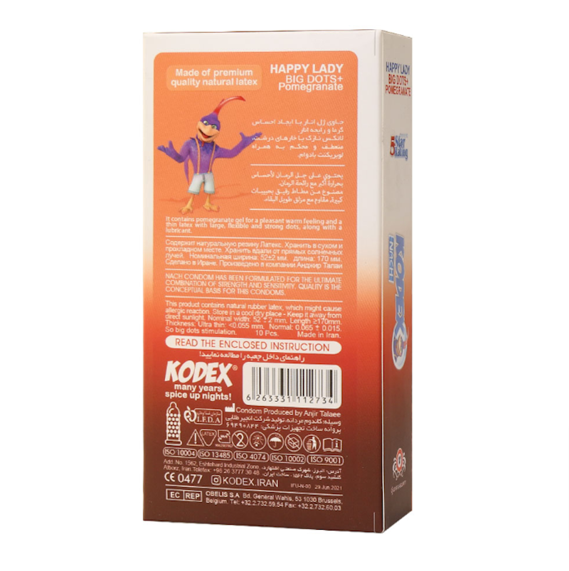 کاندوم ناچ کدکس مدل Happy Lady بسته ۱۰ عددی، محصولی از برند ناچ کدکس (Nach Kodex) است که برای افزایش تحریک و تجربه لذتبخش بانوان طراحی شده است. این کاندوم حاوی ژل انار است که با ایجاد حس گرما، تحریک را تقویت میکند. طراحی خاردار با خارهای درشت، منعطف و محکم باعث افزایش تماس و تحریک نواحی حساس میشود. لاتکس نازک و فاقد حساسیت استفادهای ایمن و راحت را تضمین میکند و لوبریکانت بادوام روی سطح کاندوم تجربهای روان و بدون اصطکاک را فراهم میآورد. رایحه دلپذیر انار، حس خوشایندی در طول رابطه ایجاد میکند و تجربهای خوشایند و تحریککننده را برای هر دو طرف به ارمغان میآورد.