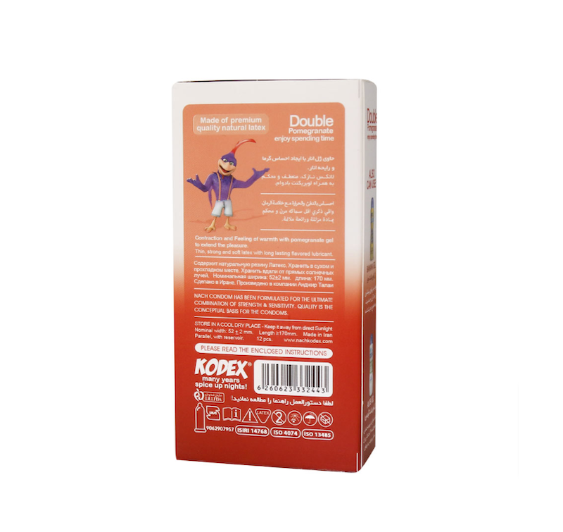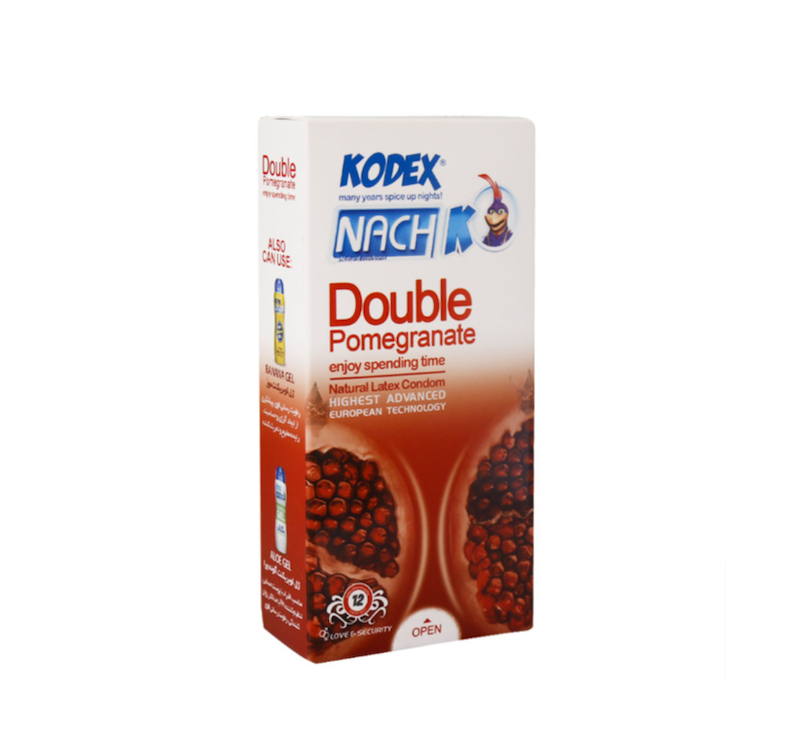 کاندوم کدکس مدل Double Pomegranate حاوی عصارۀ انار ساخته شده از لاتکس نرم و طبیعی، برای تجربۀ رابطۀ جنسی لذتبخش طراحی شده است. این کاندوم حاوی مواد روانکننده (لوبریکنت) جهت برقراری رابطۀ بدون درد است و لذت جنسی را افزایش میدهد.