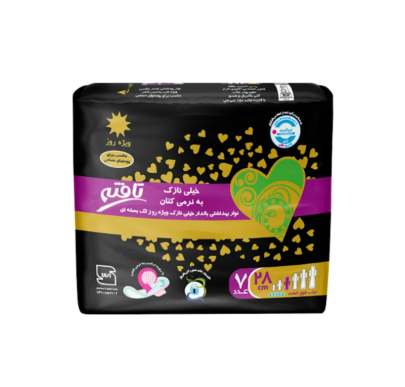 نوار بهداشتی ویژۀ روز خیلی نازک تافته، محصولی ایدهآل برای بانوان با پوستهای حساس است که باقدرت جذب بالا، ضخامت بسیار نازک و رویهٔ نرم شبیه کتان طراحی شده است. این محصول برای روزهای اول پریود مناسب بوده و از نشت خون جلوگیری میکند. با تکنولوژی آنتیباکتریال، بوی نامطبوع را از بین برده و از عفونتها پیشگیری میکند. بالههای متقارن و دنبالۀ پهنتر آن، استفادۀ طولانیمدت را راحت کرده و ضخامت نازک آن باعث میشود از روی لباس دیده نشود.