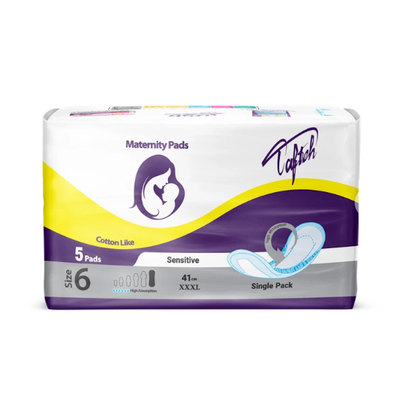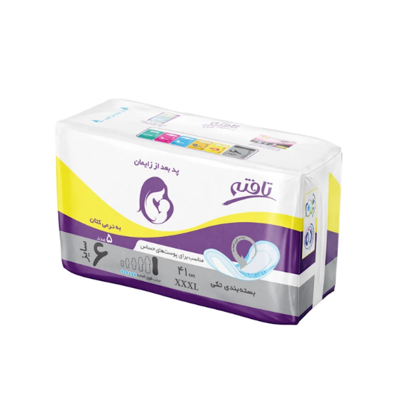 پد بعد از زایمان تافته با طراحی خاص و جذب بالا، برای جلوگیری از نشت خون در دوران خونریزی بعد از زایمان مناسب است. این پدها با قدرت جذب فوقالعاده و لایههای محافظ دوگانه (Twin Guard) ناحیۀ خونریزی را به طور کامل پوشش داده و از پسدادن خون و ایجاد بوی نامطبوع جلوگیری میکنند. جنس نرم و لطیف رویه این پدها، استفاده از آنها را برای پوستهای حساس راحت میکند. هر بسته، شامل ۵ عدد پد ۴۱ سانتیمتری است که در بستهبندیهای جداگانه قرار دارند.