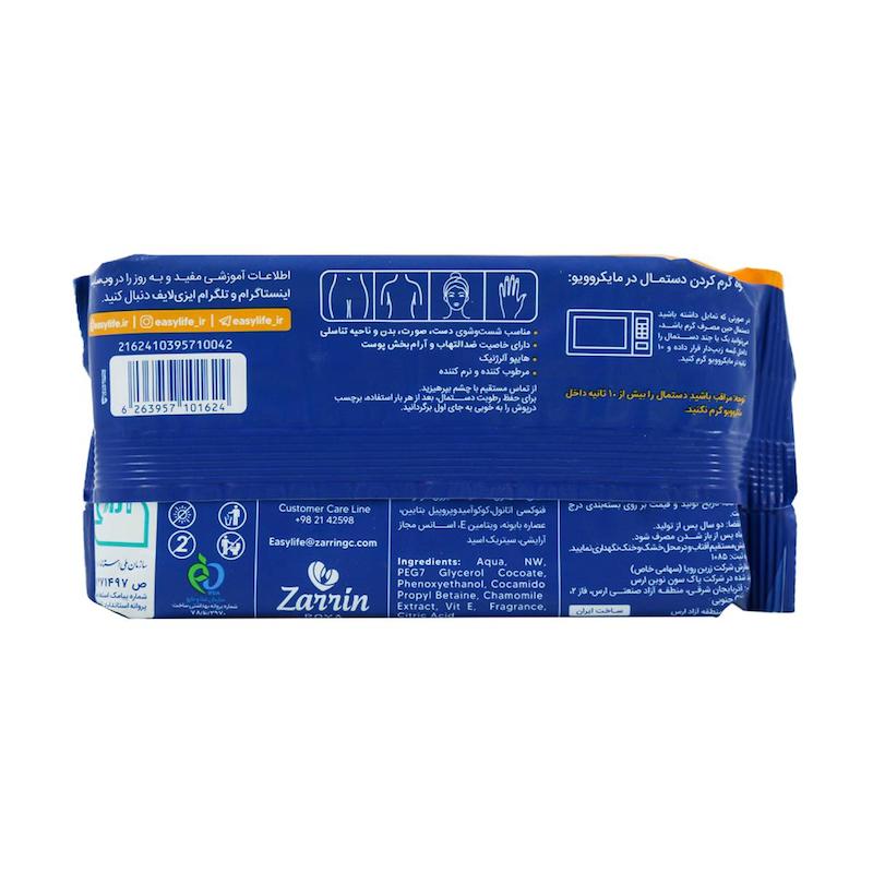 دستمال مرطوب ایزی لایف Easy Life حاوی ویتامین E و عصاره بابونه است که به مرطوبکنندگی، نرمکنندگی و کاهش التهاب پوست کمک میکند. این محصول دارای خواص آرامشبخش و ضد التهاب است و قابلیت گرم شدن در مایکروویو را دارد تا تجربهای راحت و دلپذیر برای مصرفکننده فراهم کند. طراحی هایپو آلرژنیک و سازگار با پوست آن، استفاده روزانه را ایمن و مطمئن میسازد.