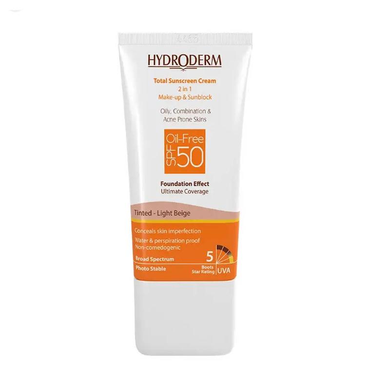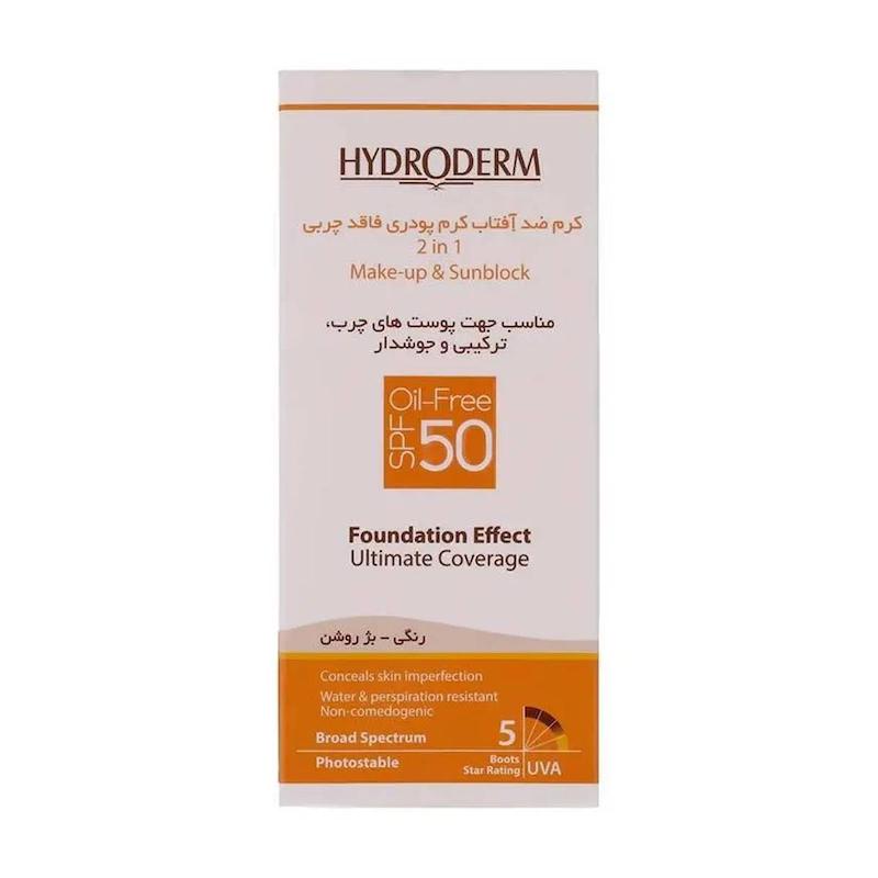 خرید ضدآفتاب کرمپودری هیدرودرم مدل Oil Free بژ روشن مناسب پوستهای چرب و جوشدار دارای SPF50 حجم 40 میلی لیتر