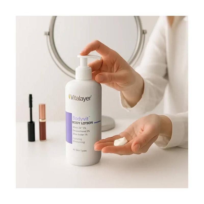 لوسیون بدن ویتالیر مدل Body Vit (Vitaler Body Vit Lotion) یک محصول غنی و تغذیهکننده برای آبرسانی و مرطوبکنندگی طولانیمدت پوست بدن است که برای انواع پوست به ویژه پوستهای خشک و حساس مناسب است. این لوسیون با ترکیبی از هیالورونیک اسید و روغن آرگان، رطوبت مورد نیاز پوست را تأمین کرده و از خشکی، ترکها و علائم پیری زودرس جلوگیری میکند. برند ویتالیر با استفاده از کره کاریته و دکسپنتنول، التهاب و خشکی پوست را ترمیم کرده و پوست را نرم، لطیف و شاداب نگه میدارد.