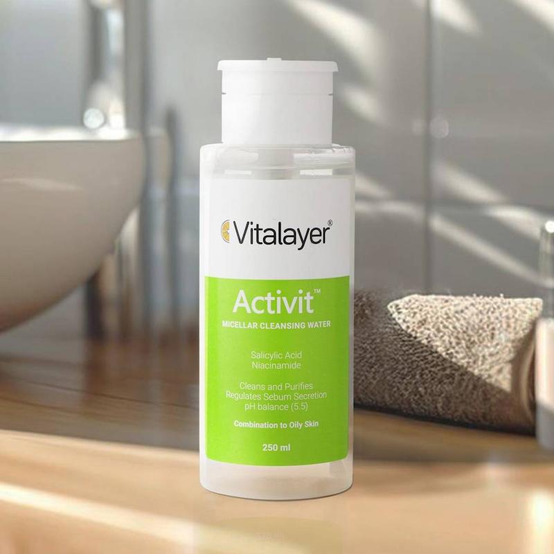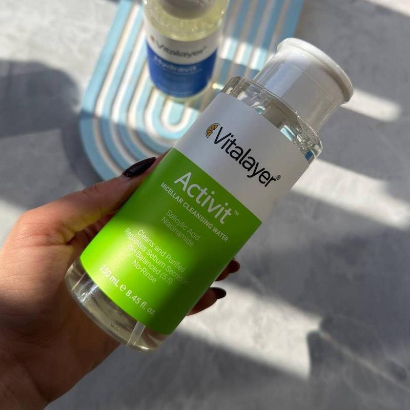 میسلار واتر Vitalayer مدل Activit حاوی ترکیبات کلیدی از جمله سالیسیلیک اسید برای پاکسازی منافذ و کاهش جوش، نیاسینامید برای کاهش چربی و بهبود شفافیت پوست، زینک پیسیای برای متعادل کردن ترشح چربی و مات کردن پوست، سدیم هیالورونات برای آبرسانی عمقی و حفظ رطوبت، و دکسپانتنول برای آرامش پوست و کاهش قرمزی است. این ترکیبات به پاکسازی عمیق پوست، حفظ لطافت و افزایش شفافیت آن کمک میکنند.