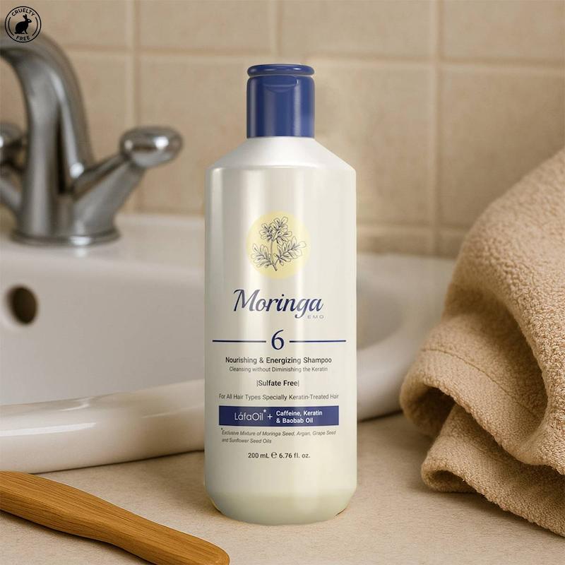 شامپو مغذی و انرژیبخش مو مورینگا امو (Moringa Emo) مدل Nourishing and Energizing شماره ۶ حجم ۴۰۰ میلیلیتر، محصولی تخصصی برای انواع مو به ویژه موهای کراتینه است که با ترکیب انحصاری لافا اویل شامل روغنهای گیاهی مورینگا، آرگان، هسته انگور، دانه آفتابگردان و ویتامینهای A و E به همراه کافئین، تغذیهرسانی عمیق به ساقه و فولیکول مو را فراهم میکند. این شامپو بدون سولفات ضمن پاکسازی موثر پوست سر و موها، از آسیب به ساختار کراتین مو جلوگیری کرده و باعث ترمیم، احیا و تقویت موها میشود.