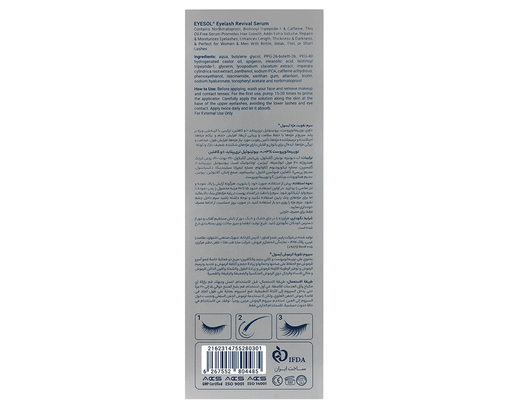 سرم تقویتکننده مژه آیسول، محصولی تخصصی از برند ایرانی آیسول است که برای تقویت، پرپشتی و افزایش طول مژهها طراحی شده است. این سرم با فرمولاسیون غنی فولیکولهای مژه را تحریک کرده و رشد، ضخامت و استحکام آنها را افزایش میدهد. وجود نور بیماتوپروست با تأیید FDA، در ترکیب این سرم مژهها را بلندتر و پرپشتتر، در حالی که تریپپتاید بیوتین و کافئین با بهبود گردش خون و تأمین اسیدهای آمینه، تکثیر سلولی و سنتز کلاژن را تقویت میکنند. پانتنول و ویتامین ای، رطوبت و تغذیه مژهها را تأمین کرده و از ریزش و شکنندگی جلوگیری میکنند. این سرم فاقد الکل، پارابن و ماینوکسیدیل بوده و برای چشمهای حساس ایمن است.