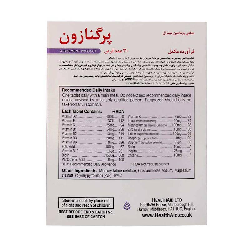 قرص پرگنازون هلث اید (Health Aid Pregnazon) یک مولتیویتامین–مینرال تخصصی است که برای بانوان در دوران قبل از بارداری، بارداری و شیردهی طراحی شده است. این مکمل با فرمولاسیونی کامل، به تأمین ریزمغذیهای ضروری مورد نیاز بدن مادر کمک میکند و همزمان از رشد طبیعی و تکامل سالم جنین حمایت مینماید. قرص پرگنازون هلث اید (Health Aid Pregnazon) حاوی ۱۲ نوع ویتامین و ۱۱ ماده معدنی مهم است و بدون ویتامین A فرموله شده تا ایمنی مصرف در این دورههای حساس حفظ شود.