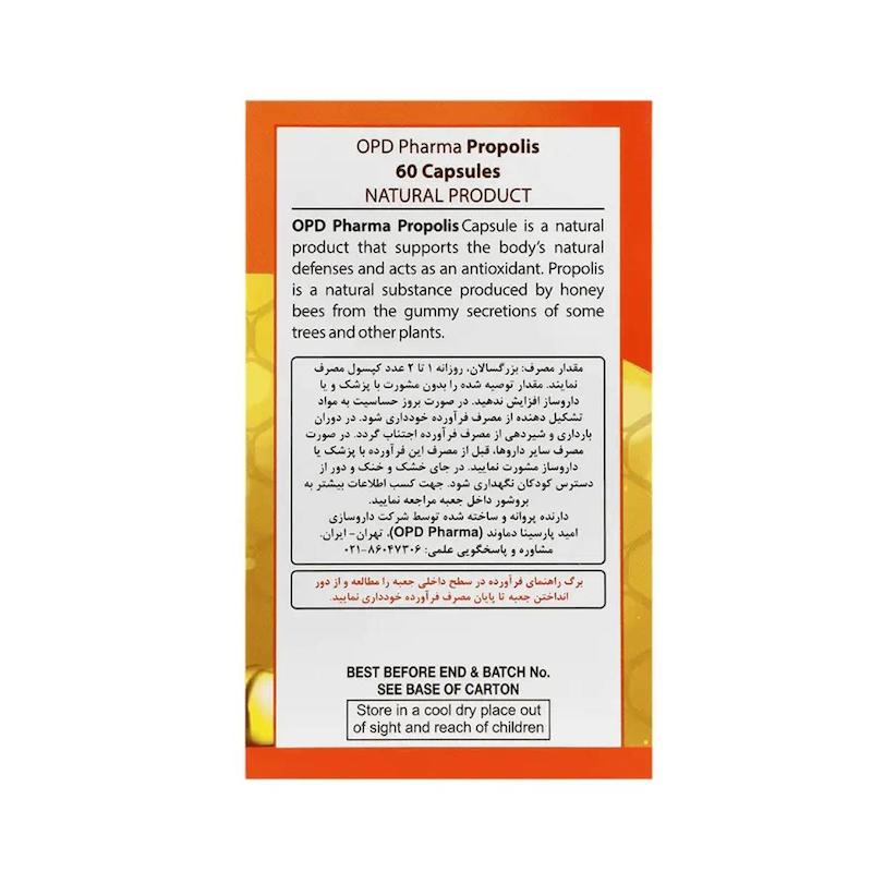 محصول در بسته ۶۰ عددی و داخل محفظه قوطی ارائه میشود. پروپولیس مادهای طبیعی است که زنبورها برای محافظت از کندو تولید میکنند و به دلیل خواص ایمنیزا و آنتیاکسیدانی خود شناخته شده است. برند او پی دی فارما با استفاده از این ترکیب ارزشمند، مکملی کاربردی برای تقویت بدن و کاهش التهاب ارائه کرده است.