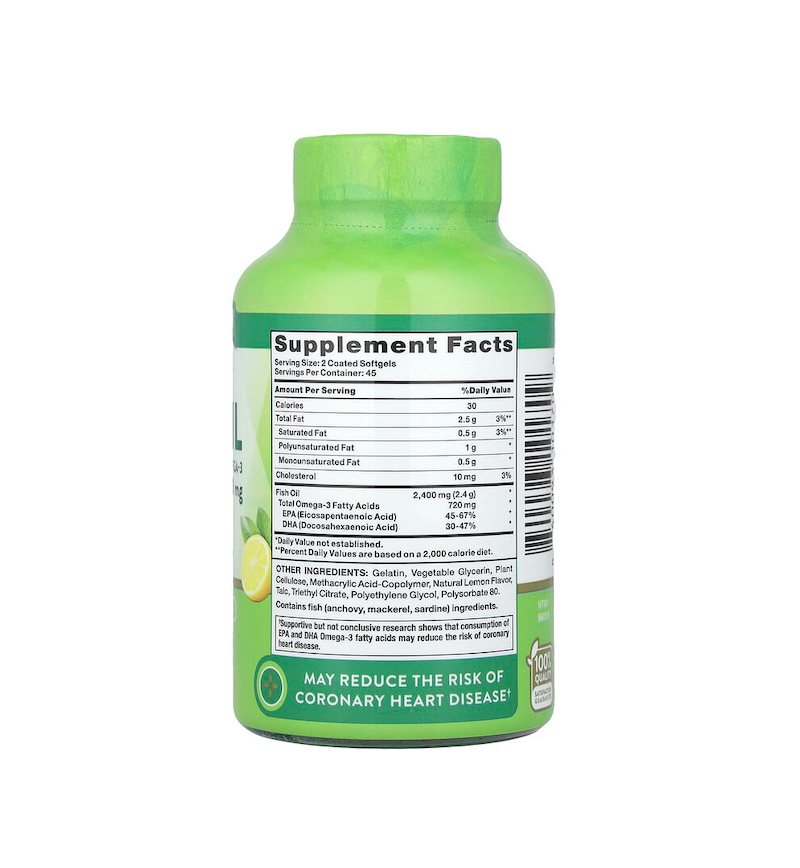 مکمل روغن ماهی لیمویی نیچرز تروث / Nature’s Truth Fish Oil Lemon با ۹۰ سافت‌ژل پوشش‌دار، یک منبع غنی از اسیدهای چرب ضروری امگا-۳ شامل EPA و DHA است که برای حفظ سلامت قلب، بهبود عملکرد مغزی و تقویت سلامت عمومی بدن اهمیت بالایی دارند. این محصول از روغن ماهی استخراج‌شده از ماهی آنچووی، ساردین و ماکرل تهیه شده و در هر وعده مصرف (۲ سافت‌ژل) ۲۴۰۰ میلی‌گرم روغن ماهی و ۷۲۰ میلی‌گرم امگا-۳ فراهم می‌کند. پوشش نرم و طعم لیمویی سافت‌ژل‌ها به کاهش بوی ماهی و سهولت مصرف کمک کرده و آن را برای استفاده روزمره مناسب‌تر می‌سازد.