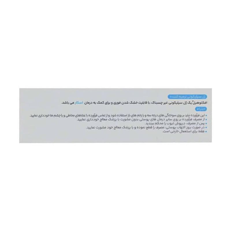 روش استفاده روزانه ۲ تا ۳ مرتبه روی پوست کاملاً تمیز و خشک، لایهای نازک از ژل را روی محل اسکار قرار دهید و اجازه دهید جذب شود. استفاده پیوسته حداقل ۶ تا ۸ هفته برای اسکارهای جدید و مدت طولانیتر برای اسکارهای قدیمی توصیه میشود. این ژل روی زخم باز قابل استفاده نیست.