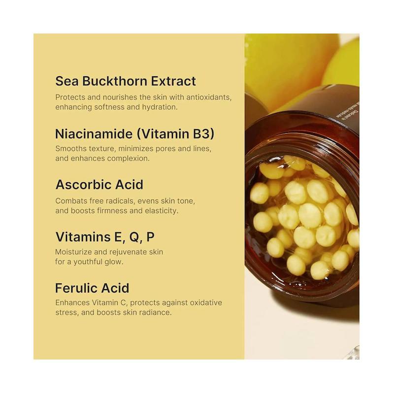 درون کپسولهای لیپوزومی این محصول، ترکیبات ارزشمندی مانند Sea Buckthorn Water تا ۵۰٪، نیاسینامید ۵٪ و ویتامین C خالص قرار دارد. این مواد تا لحظه استفاده بهطور کامل محافظت میشوند و هنگام ماساژ روی پوست فعال شده و به عمق لایههای پوستی نفوذ میکنند. ژل شفاف همراه محصول نیز سرشار از فرولیک اسید، ویتامین E و کمپلکس Q است که علاوه بر آبرسانی مؤثر، از ویتامین C پشتیبانی کرده و پایداری آن را افزایش میدهد. این ترکیب قوی در کنار هم بهطور مؤثری موجب روشنتر شدن پوست، کاهش لک و تیرگی، شفافیت بیشتر و تقویت سد محافظ پوست میشود.