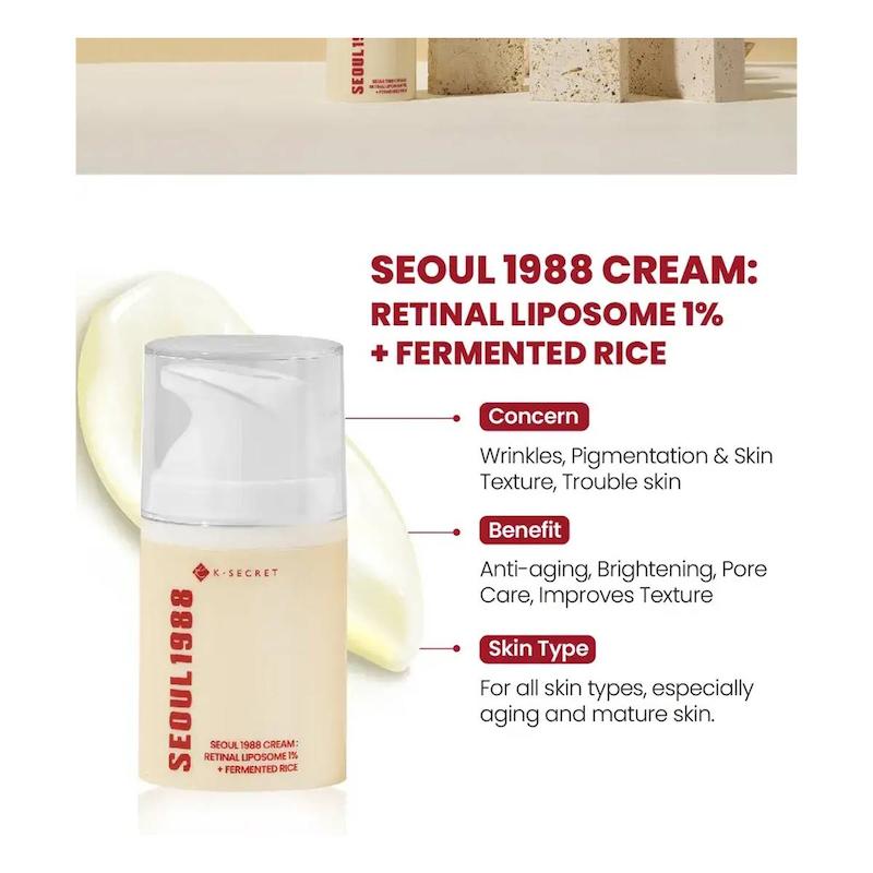 کرم ضد چروک کی‌سکرت KSECRET مدل Seoul 1988 یک کرم تخصصی شب است که با ترکیب ۱٪ رتینال لیپوزوم، عصاره برنج تخمیر شده و مجموعه‌ای از پپتیدهای فعال، به بهبود خطوط ریز، سفتی پوست و یکنواختی رنگ آن کمک می‌کند. رتینال موجود در این محصول، که یکی از قوی‌ترین مشتقات ویتامین A است، به‌صورت لیپوزومی فرموله شده تا با نفوذ عمیق‌تر و تحریک کمتر، روند بازسازی پوست را تقویت کرده و ظاهر چین‌وچروک‌ها را کاهش دهد. این ویژگی، کرم را برای افرادی مناسب می‌کند که به دنبال محصولی مؤثر برای جوانسازی با حداقل حساسیت هستند.