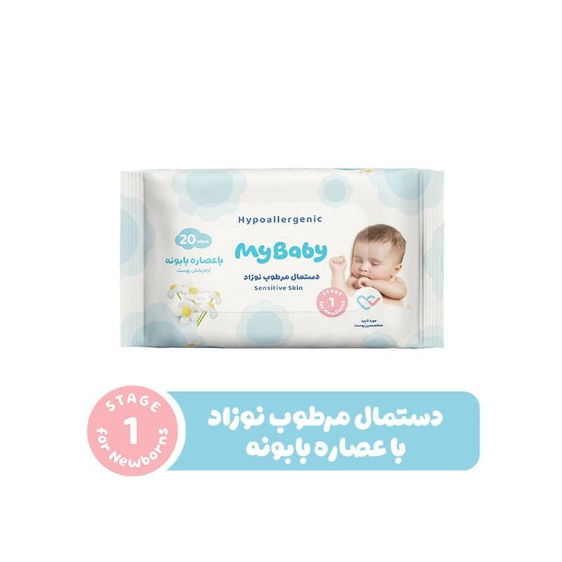 خرید دستمال مرطوب کودک مای بیبی حاوی عصارۀ بابونه مدل Baby Wet Wipes Chamomile بستۀ 20 عددی