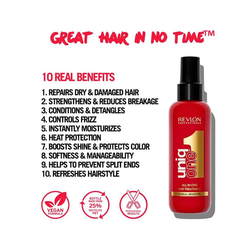 فرمولاسیون اسپری 10 کاره یونیک وان رولون (Revlon) به گونهای طراحی شده که هم در حالت خشک و هم روی موی خیس قابل استفاده است و بلافاصله باعث ایجاد شانهپذیری، کاهش گره، افزایش نرمی و بهبود حالتپذیری مو میشود. وجود فیلترهای محافظتی در این اسپری، از رنگ مو در برابر نور خورشید (UVA/UVB) محافظت میکند و به کاهش روند کمرنگ شدن رنگ کمک میکند. همچنین خاصیت ضدوز آن جلوهای یکدست و صاف به تارهای مو میبخشد.