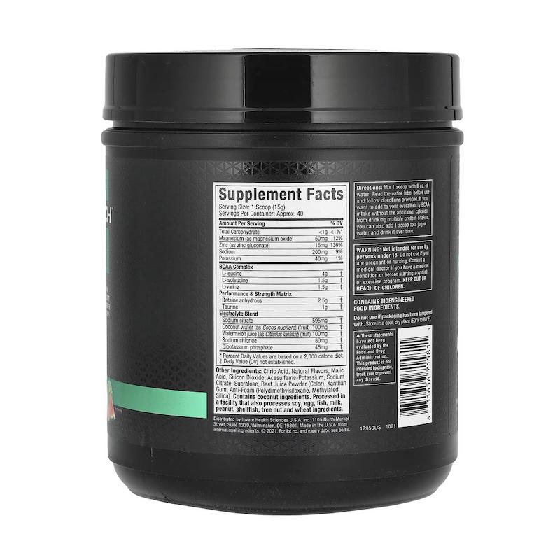 این محصول علاوه بر تأمین آمینواسیدهای ضروری، دارای الکترولیت‌های مهم مانند سدیم و پتاسیم است که به حفظ تعادل آب و الکترولیت‌ها در بدن کمک می‌کنند و مانع از دهیدراته شدن بدن در طول تمرینات می‌شوند. ارزش غذایی هر پیمانه شامل ۲۵ کیلوکالری انرژی و تنها ۱ گرم کربوهیدرات است، بنابراین بدون ایجاد نفخ یا سنگینی، انرژی لازم برای تمرینات را فراهم می‌کند.