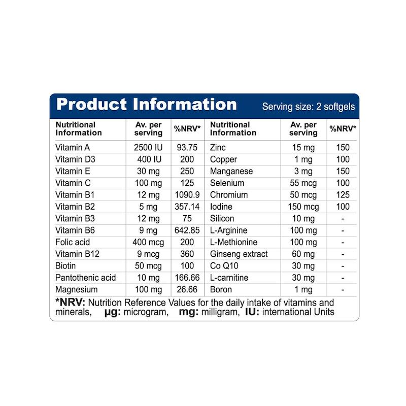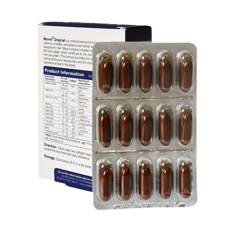 سافت ژل مولتیویتامین آقایان ویتالی تون Manvit Original یک ترکیب کامل و هدفمند برای نیازهای تغذیهای مردان است؛ مکملی که با ۲۶ ریزمغذی ضروری، اسیدهای آمینه و عصاره جینسینگ، تمام عناصر حیاتی لازم برای انرژی، تمرکز، عملکرد جنسی، باروری و سلامت عمومی بدن را پوشش میدهد. این محصول تحت لیسانس Vitapharmed سوئیس و با استانداردهای دقیق GMP تولید شده و یکی از قابلاعتمادترین مولتیویتامینها در بازار ایران است.