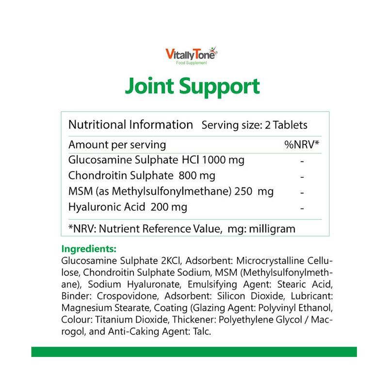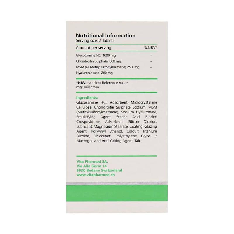 ترکیب مؤثر گلوکزآمین (1000 میلیگرم)، کندرویتین (800 میلیگرم)، MSM (250 میلیگرم) و هیالورونیک اسید (200 میلیگرم)